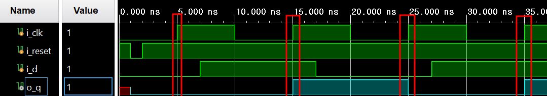 FlipFlop이므로 rising edge에서만 값이 update되는 것을 볼 수 있습니다.