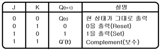 (J, K)가 (0, 0)이면 이전 값을 유지하고 (1, 1)이면 반대 값을 출력합니다.