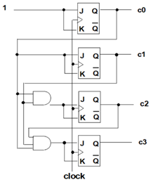 JK FlipFlop으로 이루어진 동기식 카운터입니다.