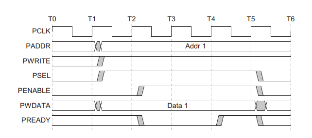 위의 Timing diagram은 PWRITE=1이라 쓰는 작업을 수행합니다.