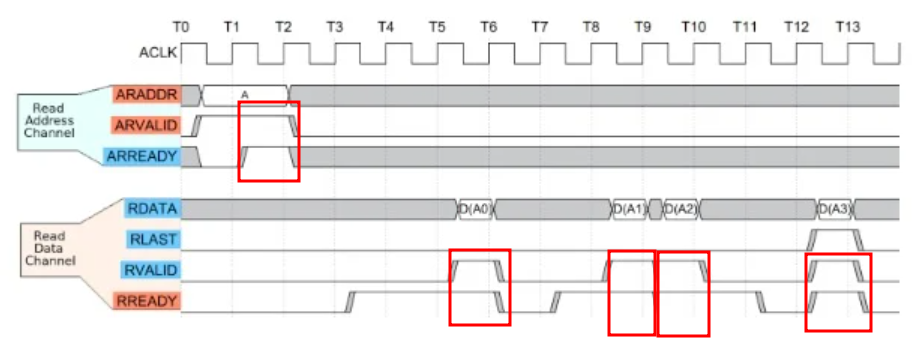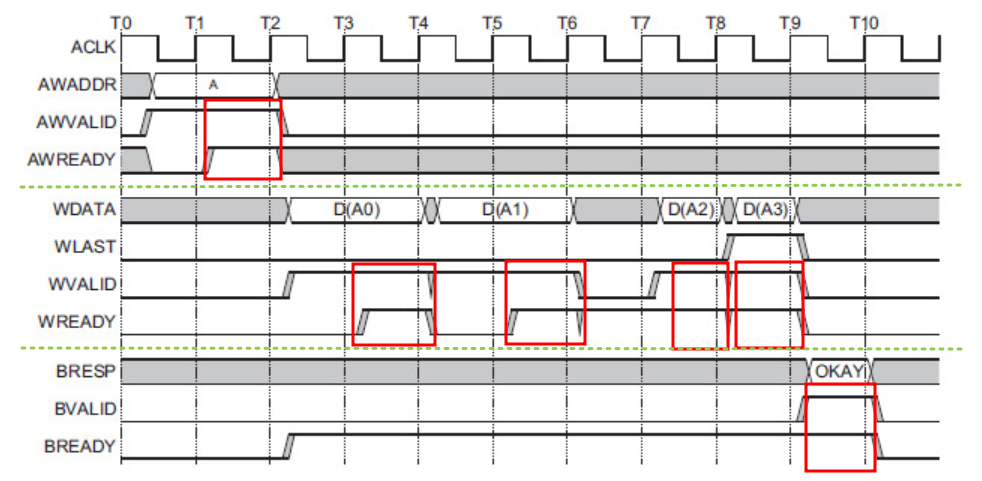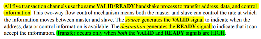 각 채널은 VALID와 READY 신호의 handshake (빨간 네모)에 맞춰 신호를 전송합니다.