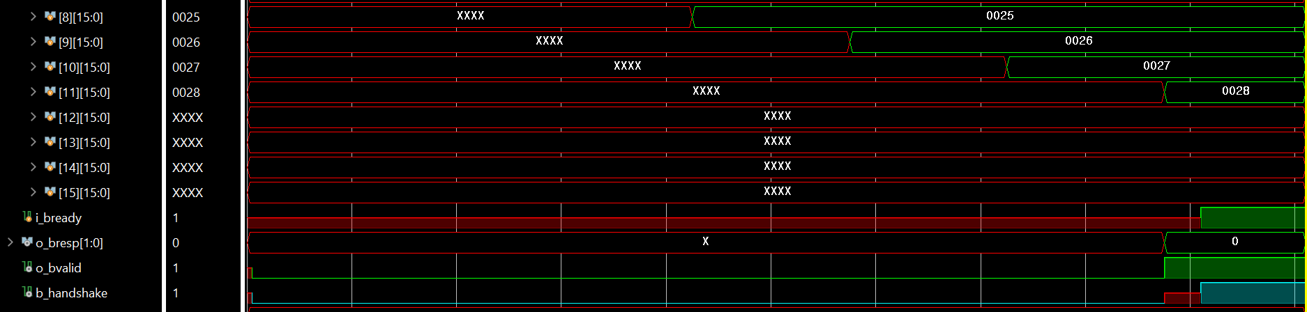 data가 모두 write되고 o_bresp가 0, 즉 okay가 뜬 것을 볼 수 있습니다.