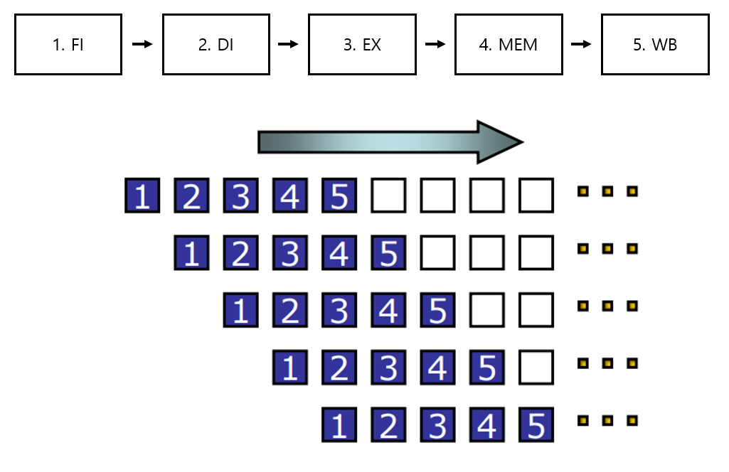 기본적인 RISC 구조는 보통 5 단계로 나누어 파이프라이닝을 합니다.