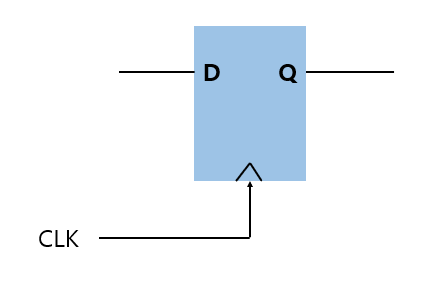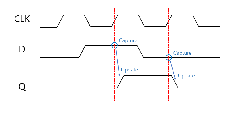 Clock의 Rising edge에서의 D 값에 따라 Q가 변합니다.