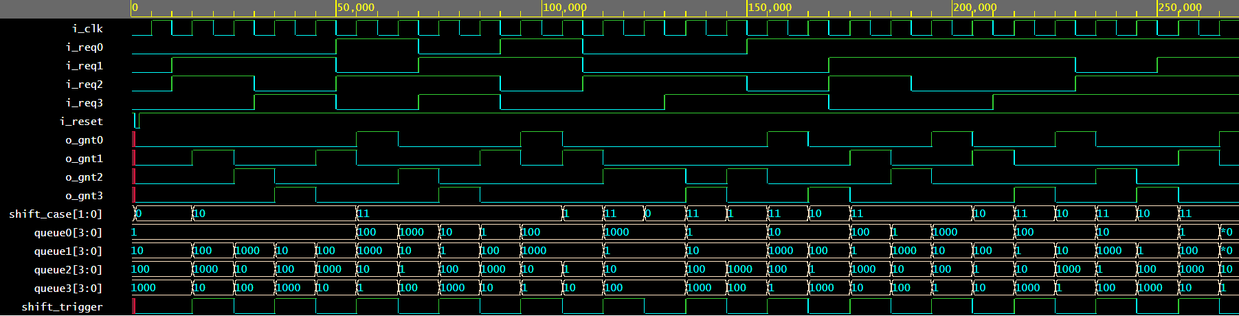 {i_req3, i_req2, i_req1, i_req0} = 4'b1010; #20