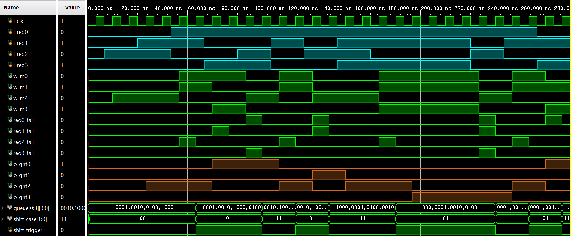 {i_req3, i_req2, i_req1, i_req0} = 4'b0011; #20